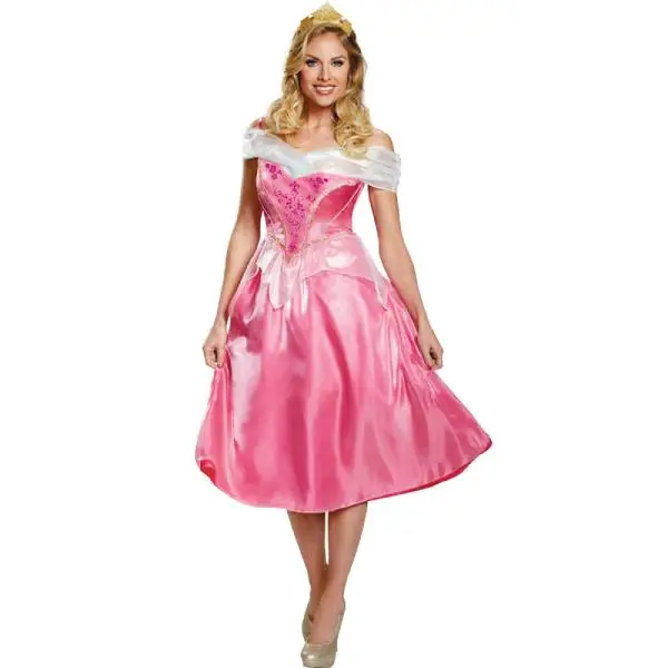 Make your magical fairytale dreams come true and live happily ever after with this stunning Sleeping Beauty Costume. Inspired from the Disney movie, Sleeping Beauty, this beautiful Womenโs Aurora Dress will transform you into your favorite Disney Princess. The Disney Sleeping Beauty Aurora Deluxe Adult Costume features a pink dress with white off-the-shoulder sheer sleeves, gold trim on bodice and sheer overlay on skirt. Also comes with gold crown headband to complete this Disney Princess look. Shoes not included.
