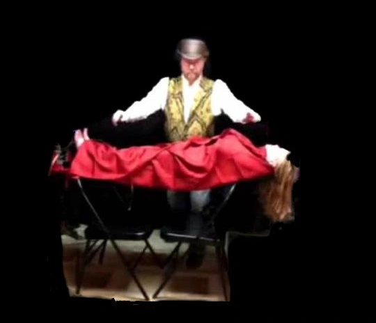 This improved version can be performed completely surrounded. The audience sees two chairs with a board laying across the backs. Someone from the audience is invited to lay on the board. They are covered with a cloth and the chair supporting their feet is removed leaving them and the board suspended in air. The board is now removed and they still remain suspended! Performer can walk completely away while the person remains suspended. Anyone up to 125 pounds can be used. Packs flat and weighs only 38 pounds.