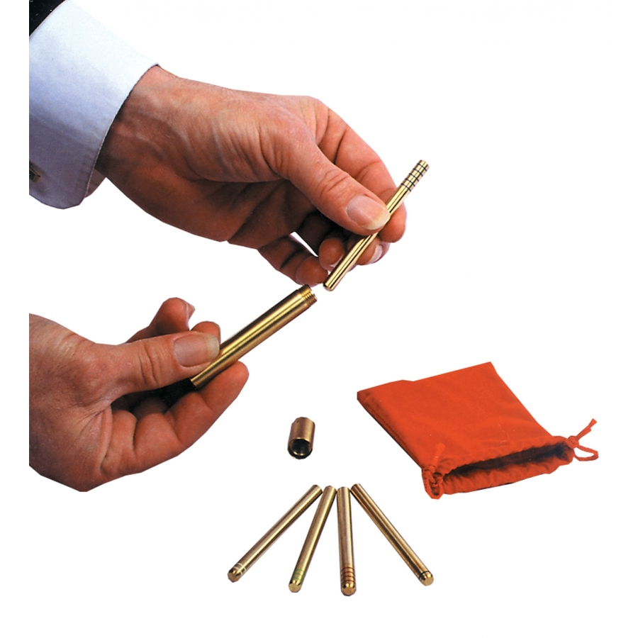 TRANS MENTAL. Spectator is handed a suede pouch along with a neat brass tube with screw on lid. The pouch is opened to reveal five brass rods, each with a different set of rings inscribed at one end. Spectator’s asked to secretly remove one of the rods, note it’s number rings and seal within the tube. When the pouch is closed, the magician is able to devine the selected rod within the tube.