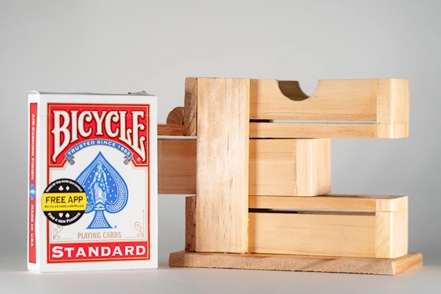 Made in the USA by Timco Magic. Magician fans a deck of cards. The cards are inserted into the wooden frame. Two cards are inserted right through the solid deck. Wait there’s more…the magician slides the frame showing the middle of the deck has vanished. The middle is slide back and the deck removed. The deck is spread and shown restored. Quality visual magic, easy to perform. Comes with handmade wooden Zig Zag frame, Bicycle card deck and instructions.